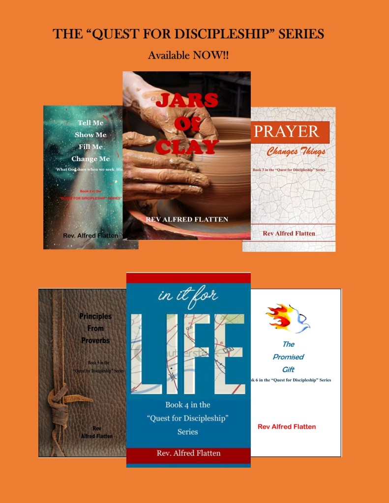 The “QUEST FOR DISCIPLESHIP” series takes you from believing in God and his purpose for your life in the book, Jars of Clay, to knowing God better in the second book, Tell Me, Show Me, Fill Me, Change Me. In the third book of the series, Prayer Changes Things, you will learn how to communicate with God. In It for Life is the fourth book and is your road map to becoming Christlike. The fifth book, Principles from Proverbs, teaches life changing principles to live by, directly from God’s word. And finally, the sixth book, The Promised Gift, tells us the “when, where, why and how” the Promised Holy Spirit gives us understanding and leads us to the abundant life that Jesus wants us to have.